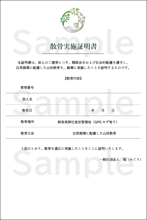 こちらは一般社団法人 環(めぐり)の散骨証明書のサンプルです。